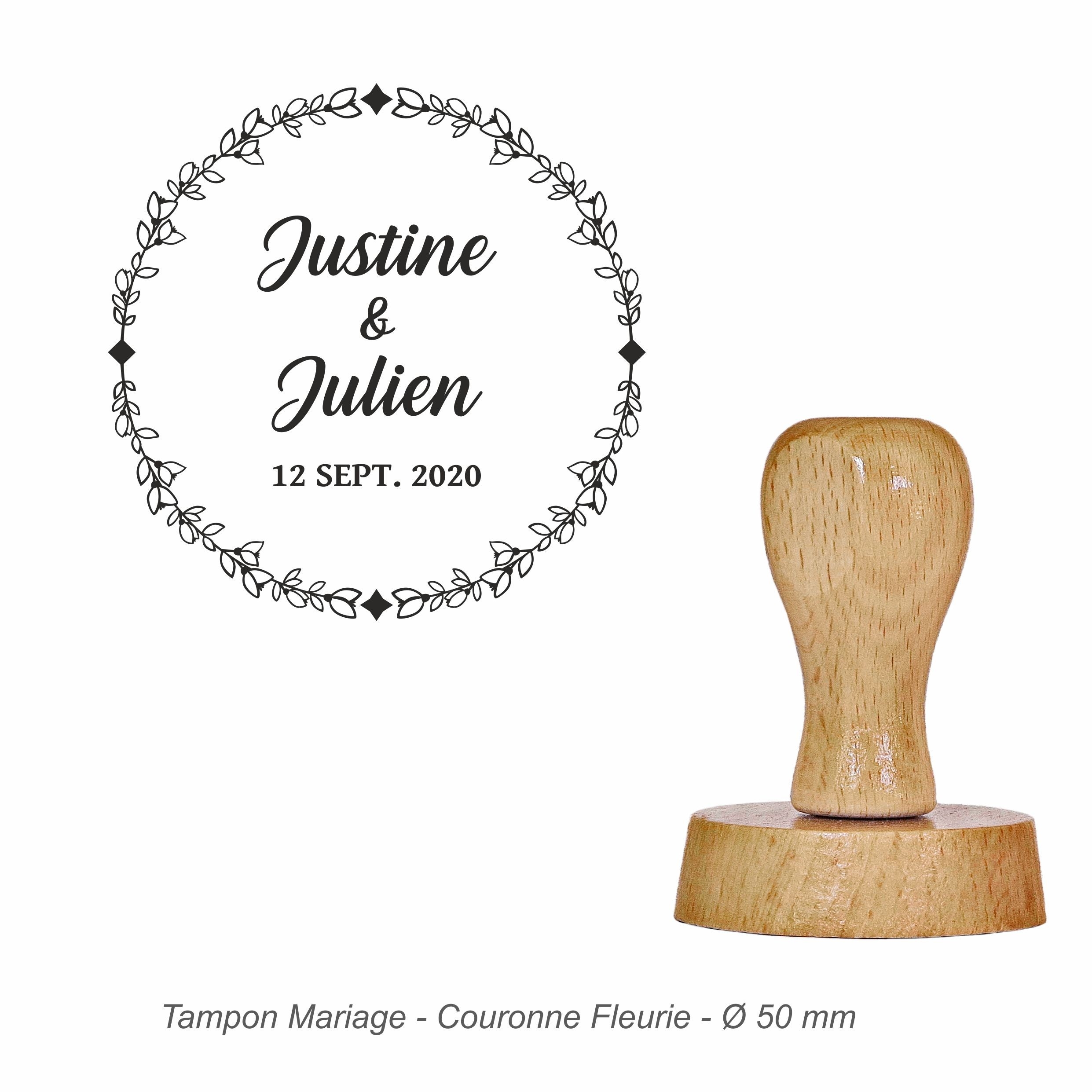 Tampon mariage "Couronne Fleurie" à personnaliser à vos prénoms et date.