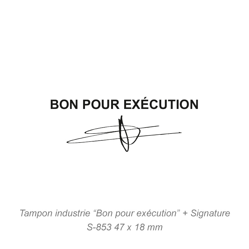 Ce tampon "Bon pour exécution" personnalisable avec votre signature est destiné à toutes les entreprises du secteur de l'industrie pour faciliter votre gestion au quotidien. Vous pouvez intégrer votre signature ci-dessous, elle sera précédée de la mention "Bon pour exécution", utile dans l'industrie quand un plan est validé.